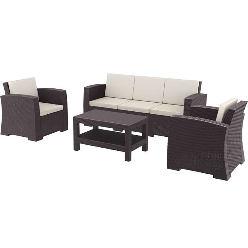 SET MONACO K/D του οίκου Siesta,σε χρώμα brown.Το SET περιλαμβάνει 1 3θέσιο καναπέ, 2 πολυθρόνες, τραπέζι και μαξιλάρια. Από υψηλής ποιότητας πολυπροπυλένιο με ενίσχυση από υαλώδεις ίνες (fiber glass) για απόλυτη αντοχή. Χωρίς μεταλλικό σκελετό για μεγαλύτερη αξιοπιστία στον χρόνο. Διαθέτει UV protection για μέγιστη προστασία από τον ήλιο ώστε να μην αλλοιωθούν τα χρώματα. Κατάλληλο για εσωτερική και εξωτερική χρήση. Πιστοποιημένο προϊόν από τον Ιταλικό οίκο CATAS.