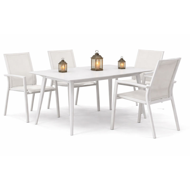Το Σέτ Περιλαμβάνει Ένα Τραπέζι Παρ/μο Και Τέσσερις Πολυθρόνες Με Διάτρητο Ύφασμα Χαρακτηριστικά: Διάσταση Τραπεζιού: 160 x 90 x 74(H) cm Διάσταση Πολυθρόνας: 56.5(W) x 62(D) x 89(H) cm Υλικό Σκελετού: Αλουμινιο