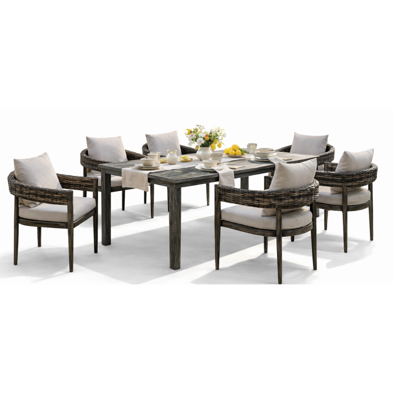Περιλαμβάνονται: 1 Τραπέζι Παραλ/μο Με Αλουμίνιο Σκελετό Διάσταση : 183 x 1015 x 76(h)cm 6 Πολυθρόνες Με Αλουμίνιο Σκελετό Και Rattan Με Αδιαβροχοποιημένα Μαξιλάρια Διάσταση : 60 x 59 x 66(h)cm * Σκελετός Αλουμινίου * Στην Τιμή Περιλαμβάνονται Και Τα Μαξιλάρια