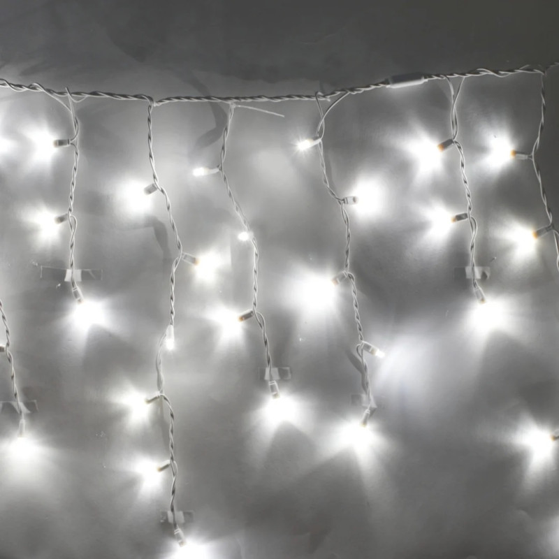Χριστουγεννιάτικα φωτάκια led 280L IP44 ασύμμετρη βροχή με μετασχηματιστή 31V σε ψυχρό λευκό (cool white) χρώμα και διάφανο καλώδιο σταθερή. Είναι επεκτεινόμενη και έχει διαστάσεις 6m*0,7m. με επιπλέον 3m τροφοδοσίας.